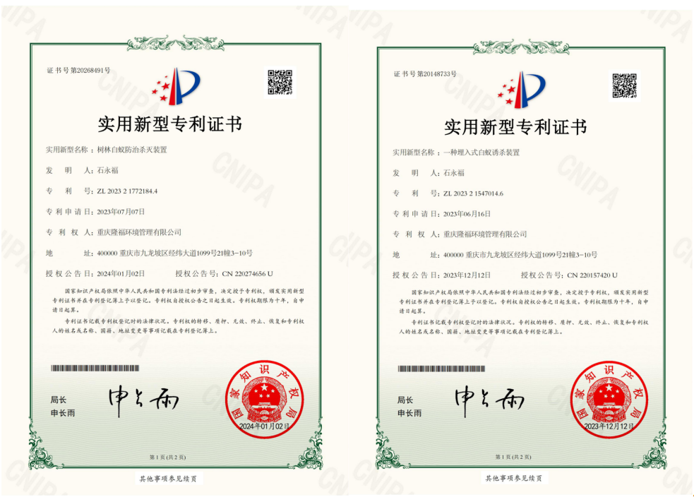 我司是全國白蟻防治標準化建設和實施的試點單位、是率先獲得“全國白蟻防治(高級)專業(yè)服務能力單位”、全國白蟻防治中心委員單位、堤壩白蟻防治標準流程化施工的創(chuàng)始單位、川渝地區(qū)首家開展白蟻防治技術(shù)培訓的教學單位、重慶市白蟻專委會理事單位、有害生物防治A級單位。